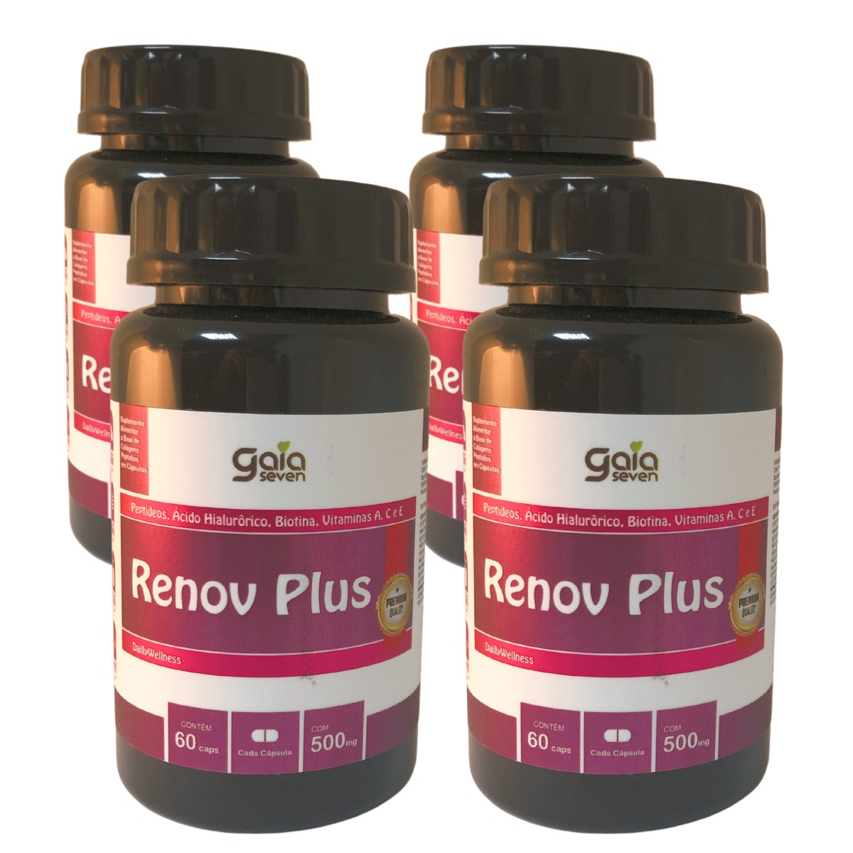 novo Renov Plus teve um upgrade em sua fórmula! Agora os ativos estão muito mais concentrados e potentes. O novo Renov Plus tem em sua fórmula os Peptídeos de Colágeno Bioativos, o Ácido Hialurônico, a Biotina e as Vitaminas A, C e E. Entenda cada ativo da fórmula: - PEPTÍDEOS DE COLÁGENO BIOATIVOS (Une os benefícios dos colágenos dos Tipos I e II) :: Maior Resistência; :: Mais Elasticidade; :: Maior Flexibilidade; :: Estimula o sistema imunológico; :: Bioativos antioxidantes e antimicrobianos :: Sustenta, prende e firma a pele.. Ação do Colágeno Tipo 1: Pele, unhas, cabelos, músculos e celulite. Ação do Colágeno Tipo 2: Cartilagens e articulações. -ÁCIDO HIALURÔNICO :: Hidrata e preenche a pele; :: Preenche os espaços entre as células; :: Estimula a produção de colágeno; :: Ajuda a suavizar linhas finas e prevenir rugas; :: Alta hidratação da pele; :: Sustentação da pele. _ BIOTINA (vitamina B7) :: Produz queratina; :: Produz colágeno e elastina (elasticidade e firmeza da pele); :: Fortalece unhas e cabelos; :: Equilibra o zinco na pele (estudos relacioanam a deficiência de zinco com o processo de envelhecimento); :: Ajuda em tratamentos como dermatite seborréica, calvice e alopecia. - VITAMINA A (retinol) :: Age diretamente na síntese do colágeno e na renovação celular; :: Deixa a pele mais firme, jovem e hidratada; :: Ação antioxidante; :: Dimimuição da oleosidade; :: Redução dos danos causados pelos raior UV; :: Colabora na redução de rugas; :: Melhora a elasticidade; :: Firmeza da pele; :: Desaceleração do envelhecimento da pele. - VITAMINA C (ácido l-ascórbico) :: Estimula a produção de colágeno e elastina; :: Ajuda no combate à flacidez; :: Ação antioxidante; :: Colabora na diminuição dos radicais livres; :: Deixa a pele viçosa e luminosa. :: Inibe a produção da enzima tirosinase (biossíntese de melanina), evitando manchas na pele. -VITAMINA E (tocoferol) :: Ação antienvelhecimento; :: Alto poder antioxidante; :: Ajuda a reduzir a produção da colagenase (uma enzima que destói o colágeno); :: Ação antiglicante (protege o colágeno dos efeitos danosos da radiação); :: Ajuda a proteger a pele contra os danos da radiação solar; :: Protege a pele contra as toxinas da poluição; :: Protege contra danos causados na pele pelo frio ou calor excessivos; :: Ajuda a hidratar peles recessadas e sensíveis. O Renov Plus da Gaia Seven auxilia no combate da perda natural de colágeno que ocorre no organismo após os 30 anos, quando começamos a perder 1% desta proteína por ano, além da perda de musculatura e ganho de flacidez. A densidade dos ossos, articulações e ligamentos também perdem elasticidade e força motora. Quanto mais o tempo passa, mais colágeno é perdido e o resultado é uma pele flácida e envelhecida, além de unhas e cabelos mais frágeis, isso ocorre porque o metabolismo fica cada vez mais lento.