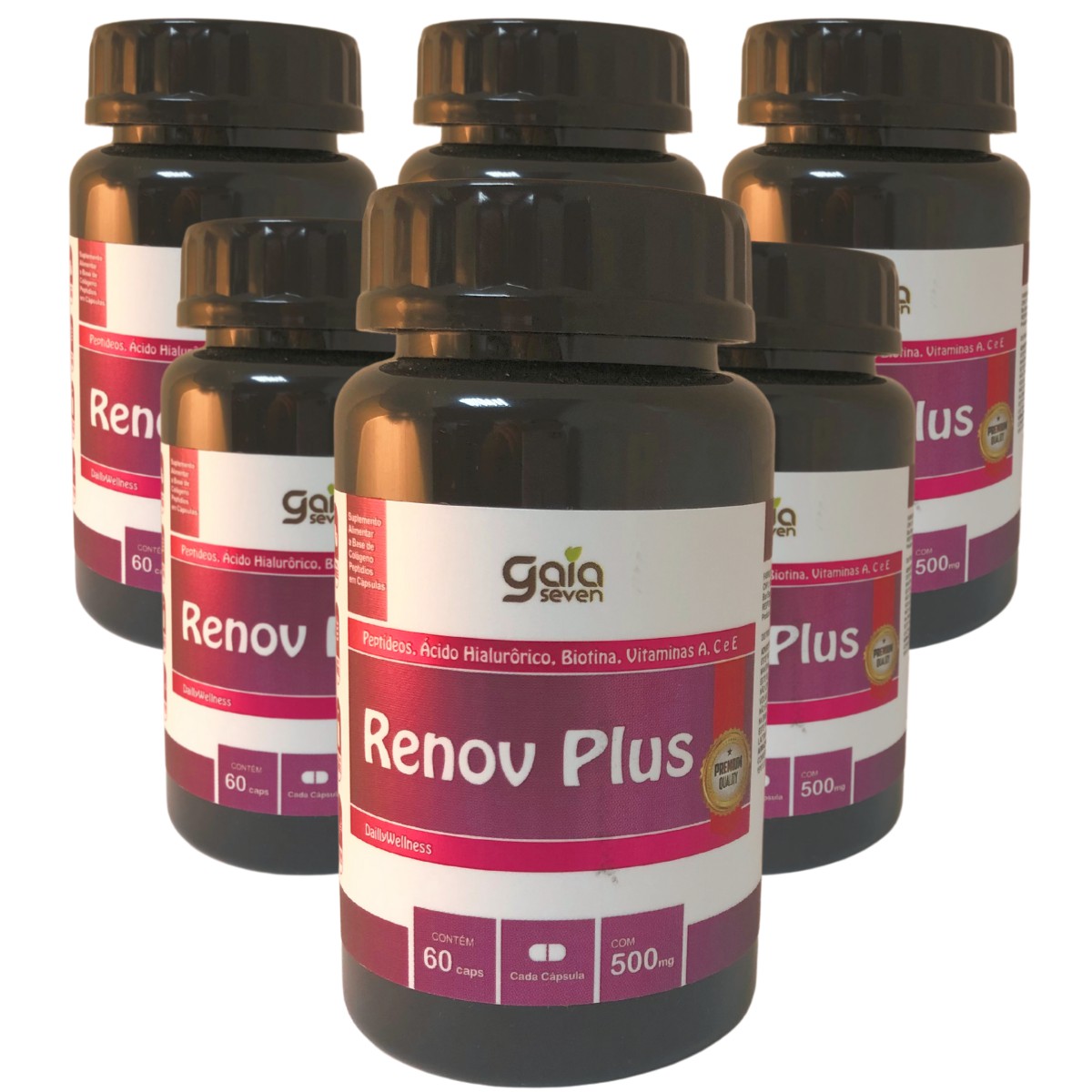 novo Renov Plus teve um upgrade em sua fórmula! Agora os ativos estão muito mais concentrados e potentes. O novo Renov Plus tem em sua fórmula os Peptídeos de Colágeno Bioativos, o Ácido Hialurônico, a Biotina e as Vitaminas A, C e E. Entenda cada ativo da fórmula: - PEPTÍDEOS DE COLÁGENO BIOATIVOS (Une os benefícios dos colágenos dos Tipos I e II) :: Maior Resistência; :: Mais Elasticidade; :: Maior Flexibilidade; :: Estimula o sistema imunológico; :: Bioativos antioxidantes e antimicrobianos :: Sustenta, prende e firma a pele.. Ação do Colágeno Tipo 1: Pele, unhas, cabelos, músculos e celulite. Ação do Colágeno Tipo 2: Cartilagens e articulações. -ÁCIDO HIALURÔNICO :: Hidrata e preenche a pele; :: Preenche os espaços entre as células; :: Estimula a produção de colágeno; :: Ajuda a suavizar linhas finas e prevenir rugas; :: Alta hidratação da pele; :: Sustentação da pele. _ BIOTINA (vitamina B7) :: Produz queratina; :: Produz colágeno e elastina (elasticidade e firmeza da pele); :: Fortalece unhas e cabelos; :: Equilibra o zinco na pele (estudos relacioanam a deficiência de zinco com o processo de envelhecimento); :: Ajuda em tratamentos como dermatite seborréica, calvice e alopecia. - VITAMINA A (retinol) :: Age diretamente na síntese do colágeno e na renovação celular; :: Deixa a pele mais firme, jovem e hidratada; :: Ação antioxidante; :: Dimimuição da oleosidade; :: Redução dos danos causados pelos raior UV; :: Colabora na redução de rugas; :: Melhora a elasticidade; :: Firmeza da pele; :: Desaceleração do envelhecimento da pele. - VITAMINA C (ácido l-ascórbico) :: Estimula a produção de colágeno e elastina; :: Ajuda no combate à flacidez; :: Ação antioxidante; :: Colabora na diminuição dos radicais livres; :: Deixa a pele viçosa e luminosa. :: Inibe a produção da enzima tirosinase (biossíntese de melanina), evitando manchas na pele. -VITAMINA E (tocoferol) :: Ação antienvelhecimento; :: Alto poder antioxidante; :: Ajuda a reduzir a produção da colagenase (uma enzima que destói o colágeno); :: Ação antiglicante (protege o colágeno dos efeitos danosos da radiação); :: Ajuda a proteger a pele contra os danos da radiação solar; :: Protege a pele contra as toxinas da poluição; :: Protege contra danos causados na pele pelo frio ou calor excessivos; :: Ajuda a hidratar peles recessadas e sensíveis. O Renov Plus da Gaia Seven auxilia no combate da perda natural de colágeno que ocorre no organismo após os 30 anos, quando começamos a perder 1% desta proteína por ano, além da perda de musculatura e ganho de flacidez. A densidade dos ossos, articulações e ligamentos também perdem elasticidade e força motora. Quanto mais o tempo passa, mais colágeno é perdido e o resultado é uma pele flácida e envelhecida, além de unhas e cabelos mais frágeis, isso ocorre porque o metabolismo fica cada vez mais lento.