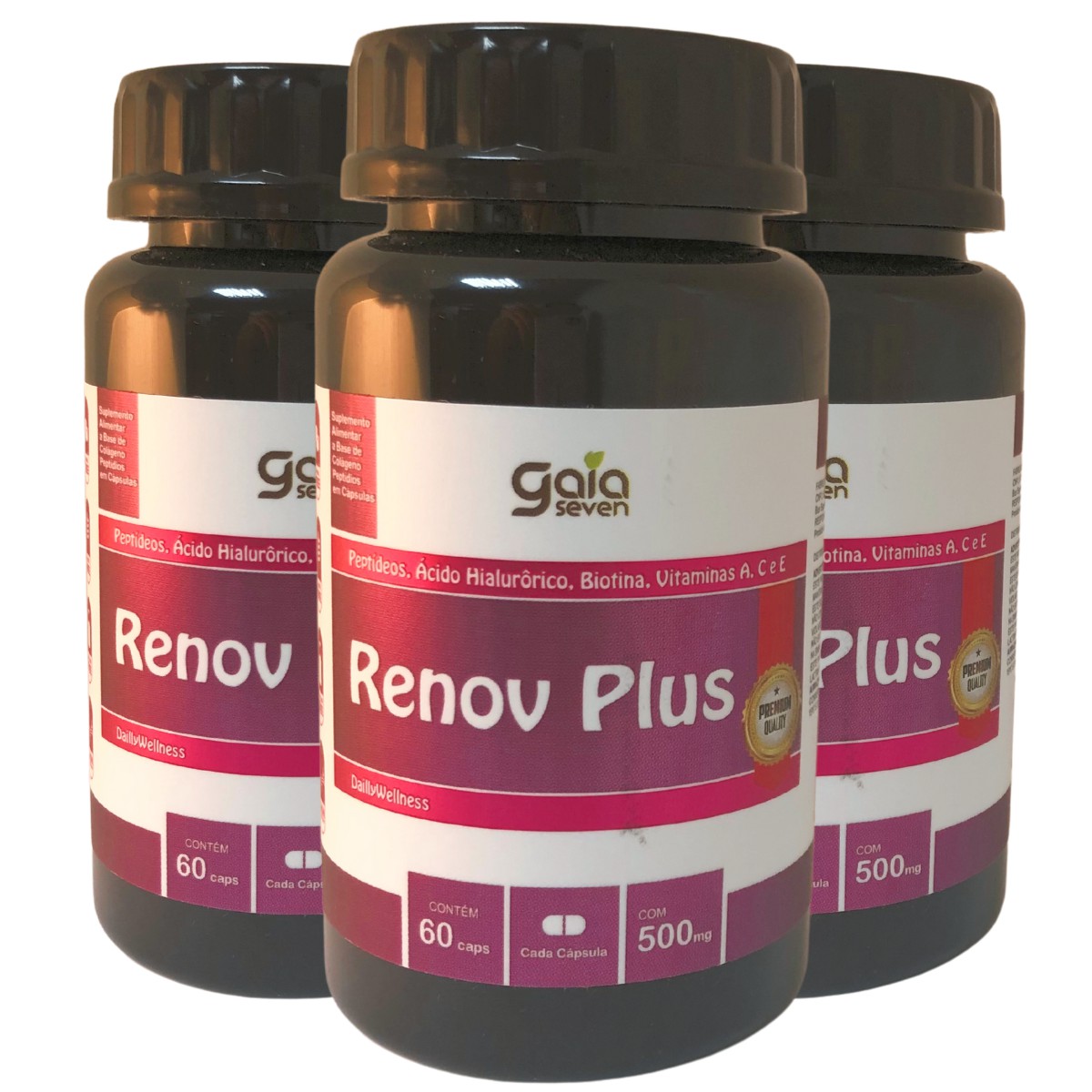 O novo Renov Plus teve um upgrade em sua fórmula! Agora os ativos estão muito mais concentrados e potentes. O novo Renov Plus tem em sua fórmula os Peptídeos de Colágeno Bioativos, o Ácido Hialurônico, a Biotina e as Vitaminas A, C e E. Entenda cada ativo da fórmula: - PEPTÍDEOS DE COLÁGENO BIOATIVOS (Une os benefícios dos colágenos dos Tipos I e II) :: Maior Resistência; :: Mais Elasticidade; :: Maior Flexibilidade; :: Estimula o sistema imunológico; :: Bioativos antioxidantes e antimicrobianos :: Sustenta, prende e firma a pele.. Ação do Colágeno Tipo 1: Pele, unhas, cabelos, músculos e celulite. Ação do Colágeno Tipo 2: Cartilagens e articulações. -ÁCIDO HIALURÔNICO :: Hidrata e preenche a pele; :: Preenche os espaços entre as células; :: Estimula a produção de colágeno; :: Ajuda a suavizar linhas finas e prevenir rugas; :: Alta hidratação da pele; :: Sustentação da pele. _ BIOTINA (vitamina B7) :: Produz queratina; :: Produz colágeno e elastina (elasticidade e firmeza da pele); :: Fortalece unhas e cabelos; :: Equilibra o zinco na pele (estudos relacioanam a deficiência de zinco com o processo de envelhecimento); :: Ajuda em tratamentos como dermatite seborréica, calvice e alopecia. - VITAMINA A (retinol) :: Age diretamente na síntese do colágeno e na renovação celular; :: Deixa a pele mais firme, jovem e hidratada; :: Ação antioxidante; :: Dimimuição da oleosidade; :: Redução dos danos causados pelos raior UV; :: Colabora na redução de rugas; :: Melhora a elasticidade; :: Firmeza da pele; :: Desaceleração do envelhecimento da pele. - VITAMINA C (ácido l-ascórbico) :: Estimula a produção de colágeno e elastina; :: Ajuda no combate à flacidez; :: Ação antioxidante; :: Colabora na diminuição dos radicais livres; :: Deixa a pele viçosa e luminosa. :: Inibe a produção da enzima tirosinase (biossíntese de melanina), evitando manchas na pele. -VITAMINA E (tocoferol) :: Ação antienvelhecimento; :: Alto poder antioxidante; :: Ajuda a reduzir a produção da colagenase (uma enzima que destói o colágeno); :: Ação antiglicante (protege o colágeno dos efeitos danosos da radiação); :: Ajuda a proteger a pele contra os danos da radiação solar; :: Protege a pele contra as toxinas da poluição; :: Protege contra danos causados na pele pelo frio ou calor excessivos; :: Ajuda a hidratar peles recessadas e sensíveis. O Renov Plus da Gaia Seven auxilia no combate da perda natural de colágeno que ocorre no organismo após os 30 anos, quando começamos a perder 1% desta proteína por ano, além da perda de musculatura e ganho de flacidez. A densidade dos ossos, articulações e ligamentos também perdem elasticidade e força motora. Quanto mais o tempo passa, mais colágeno é perdido e o resultado é uma pele flácida e envelhecida, além de unhas e cabelos mais frágeis, isso ocorre porque o metabolismo fica cada vez mais lento.