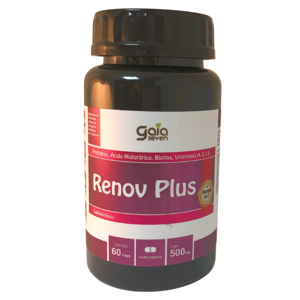 O novo Renov Plus teve um upgrade em sua fórmula! Agora os ativos estão muito mais concentrados e potentes. O novo Renov Plus tem em sua fórmula os Peptídeos de Colágeno Bioativos, o Ácido Hialurônico, a Biotina e as Vitaminas A, C e E. Entenda cada ativo da fórmula: - PEPTÍDEOS DE COLÁGENO BIOATIVOS (Une os benefícios dos colágenos dos Tipos I e II) :: Maior Resistência; :: Mais Elasticidade; :: Maior Flexibilidade; :: Estimula o sistema imunológico; :: Bioativos antioxidantes e antimicrobianos :: Sustenta, prende e firma a pele.. Ação do Colágeno Tipo 1: Pele, unhas, cabelos, músculos e celulite. Ação do Colágeno Tipo 2: Cartilagens e articulações. -ÁCIDO HIALURÔNICO :: Hidrata e preenche a pele; :: Preenche os espaços entre as células; :: Estimula a produção de colágeno; :: Ajuda a suavizar linhas finas e prevenir rugas; :: Alta hidratação da pele; :: Sustentação da pele. _ BIOTINA (vitamina B7) :: Produz queratina; :: Produz colágeno e elastina (elasticidade e firmeza da pele); :: Fortalece unhas e cabelos; :: Equilibra o zinco na pele (estudos relacioanam a deficiência de zinco com o processo de envelhecimento); :: Ajuda em tratamentos como dermatite seborréica, calvice e alopecia. - VITAMINA A (retinol) :: Age diretamente na síntese do colágeno e na renovação celular; :: Deixa a pele mais firme, jovem e hidratada; :: Ação antioxidante; :: Dimimuição da oleosidade; :: Redução dos danos causados pelos raior UV; :: Colabora na redução de rugas; :: Melhora a elasticidade; :: Firmeza da pele; :: Desaceleração do envelhecimento da pele. - VITAMINA C (ácido l-ascórbico) :: Estimula a produção de colágeno e elastina; :: Ajuda no combate à flacidez; :: Ação antioxidante; :: Colabora na diminuição dos radicais livres; :: Deixa a pele viçosa e luminosa. :: Inibe a produção da enzima tirosinase (biossíntese de melanina), evitando manchas na pele. -VITAMINA E (tocoferol) :: Ação antienvelhecimento; :: Alto poder antioxidante; :: Ajuda a reduzir a produção da colagenase (uma enzima que destói o colágeno); :: Ação antiglicante (protege o colágeno dos efeitos danosos da radiação); :: Ajuda a proteger a pele contra os danos da radiação solar; :: Protege a pele contra as toxinas da poluição; :: Protege contra danos causados na pele pelo frio ou calor excessivos; :: Ajuda a hidratar peles recessadas e sensíveis. O Renov Plus da Gaia Seven auxilia no combate da perda natural de colágeno que ocorre no organismo após os 30 anos, quando começamos a perder 1% desta proteína por ano, além da perda de musculatura e ganho de flacidez. A densidade dos ossos, articulações e ligamentos também perdem elasticidade e força motora. Quanto mais o tempo passa, mais colágeno é perdido e o resultado é uma pele flácida e envelhecida, além de unhas e cabelos mais frágeis, isso ocorre porque o metabolismo fica cada vez mais lento.